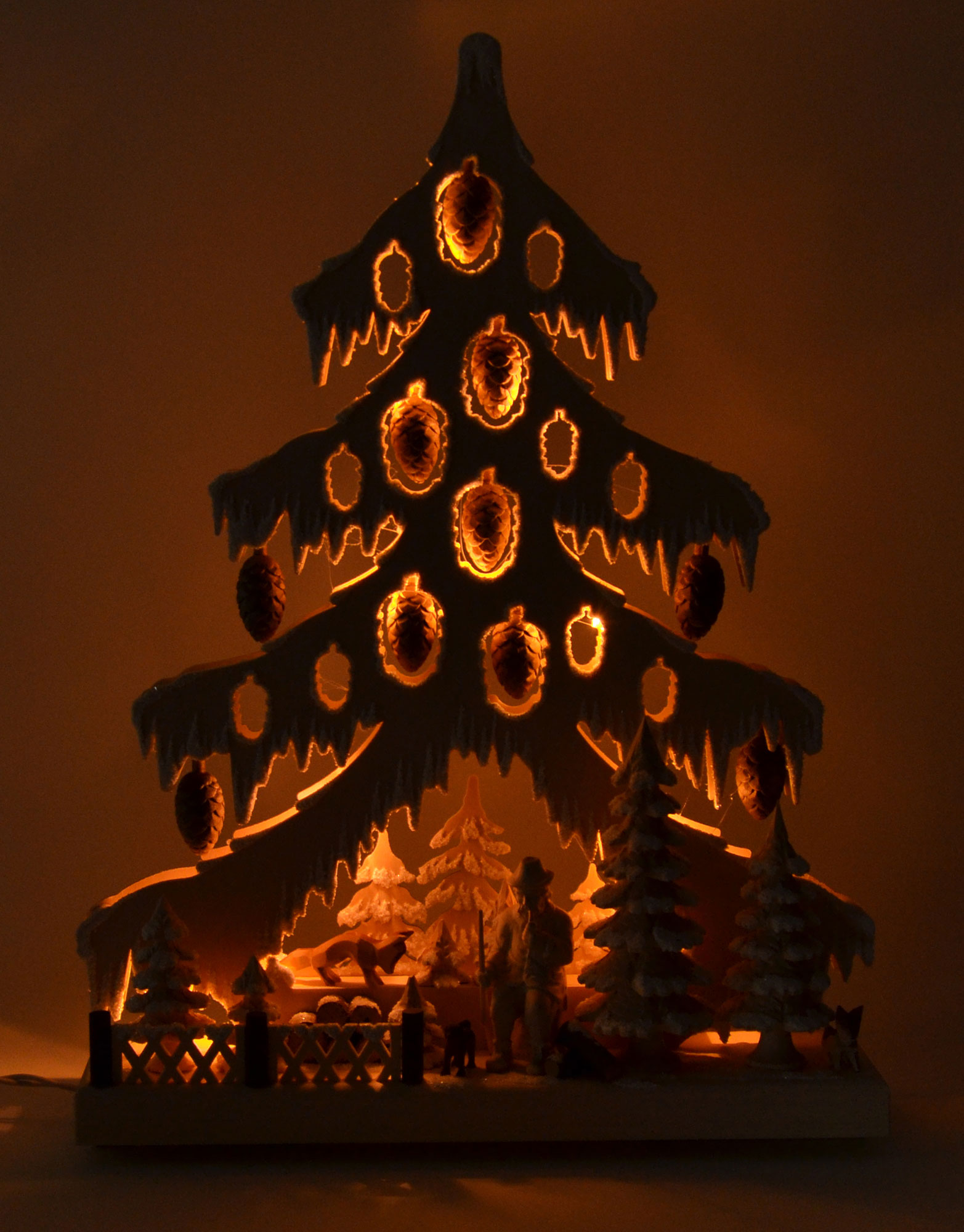 Unter einer schönen Tanne, mit geschnitzten, farblich abgesetzten Zapfen, macht es sich ein Waldmann nach getaner Arbeit gemütlich. Pfeife rauchend betrachtet er die handgeschnitzten Bäumchen um sich herum. Zwei handgeschnitzte Füchse haben den geschnitzten Hund des Waldmannes bemerkt und beobachten ihn interessiert. Durch die indirekte Beleuchtung bekommt die 3D-Tanne ihren ganz besonderen Reiz.