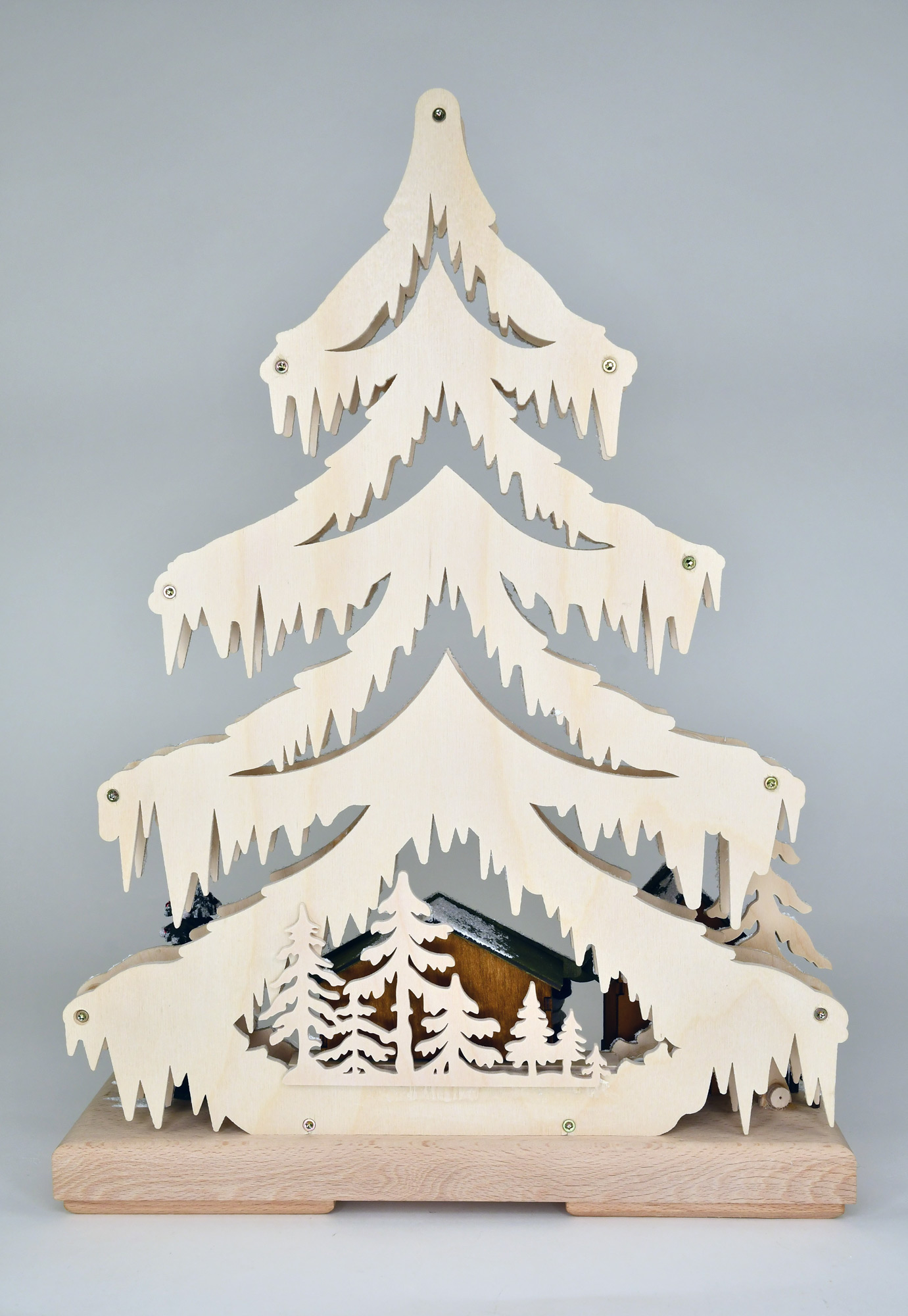 Diese Tanne zeigt einen erzgebirgischen Weihnachtsmarkt. Neben dem unverzichtbaren Glühweinstand, sehen wir auch den typischen Schwibbogenhändler. Eine RATAGS-Massivholzfigur ist mit seinem Hündchen unterwegs und hat schon die ersten Weihnachtsgeschenke ergattert. Ein leichter Schnee verbreitet eine winterliche Stimmung. Die indirekt verbaute, blendfreie LED-Beleuchtung schafft eine behagliche Atmosphäre. Diese Tanne ist dekoratives Stück Handarbeit aus dem Hause RATAGS.