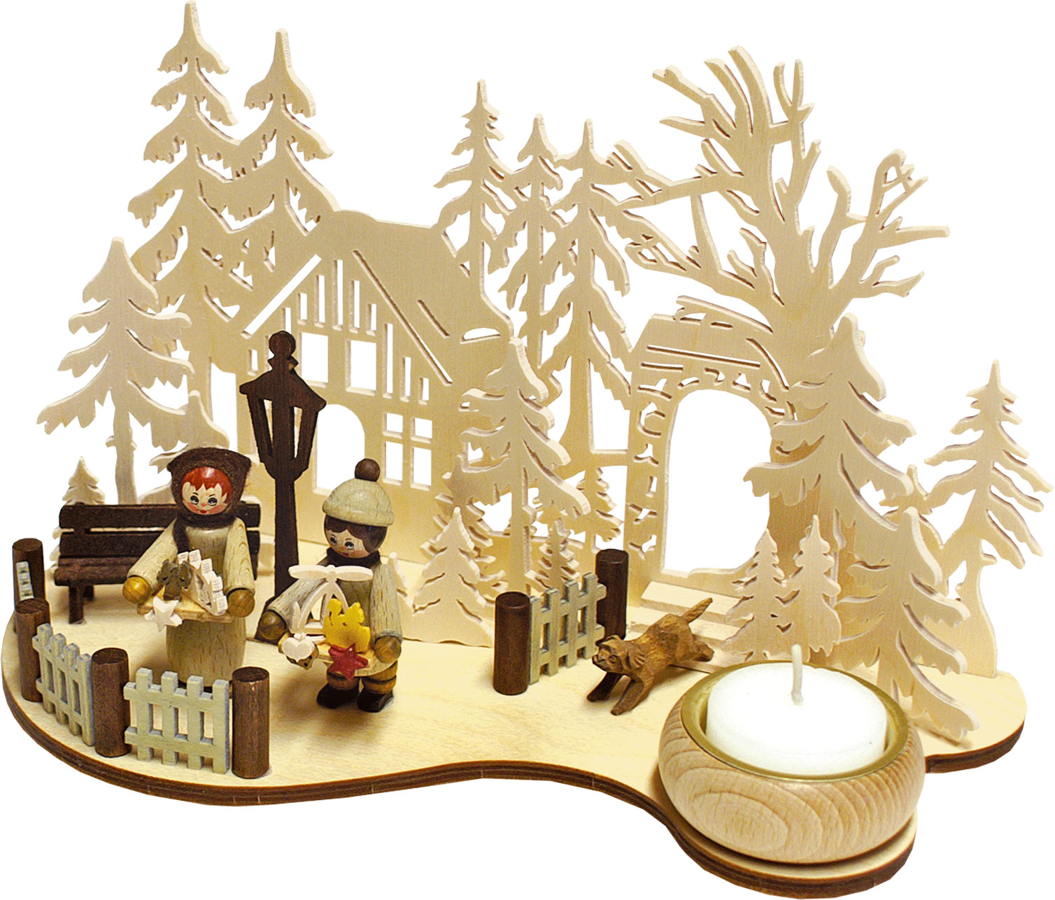 Der herrliche Tischschmuck wurde mit 2 gedrechselten Striezelkindern, einem geschnitzten Hund, einer Bank, einer Laterne, Zaun und einem Massivholzteelichthalter bestückt. Im Hintergrund wird ein Haus mit Torbogen gezeigt.