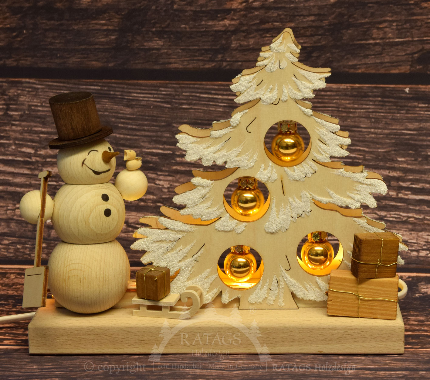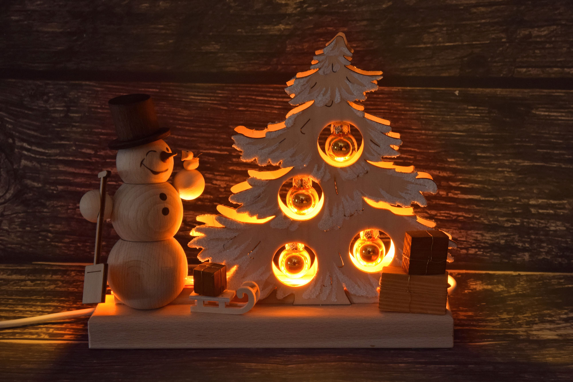 Dieser winterliche Tischschmuck zeigt einen lustigen Schneemann mit Schneeschieber und einem singenden Vögelchen auf dem Arm. Neben ihm steht ein Weihnachtsbaum, mit goldenen Kugelnbestückt und mit Raureif beschneit. Eine blendfrei verbaute LED-Beleuchtung bringt die Details zum Leuchten und sorgt für schöne Lichteffekte auf Ihrem Tisch. Ein schönes Stück erzgebirgischer Holzkunst für die Advents- und Weihnachtszeit.