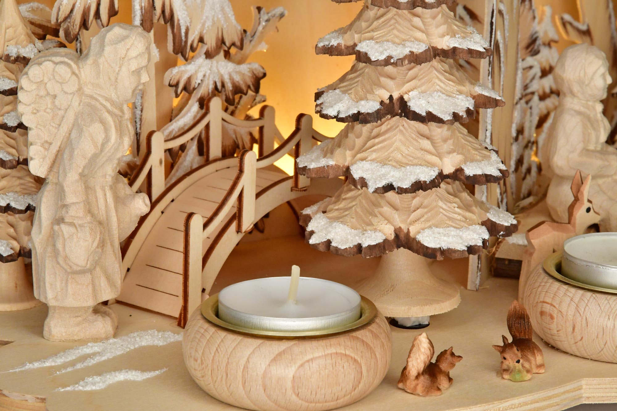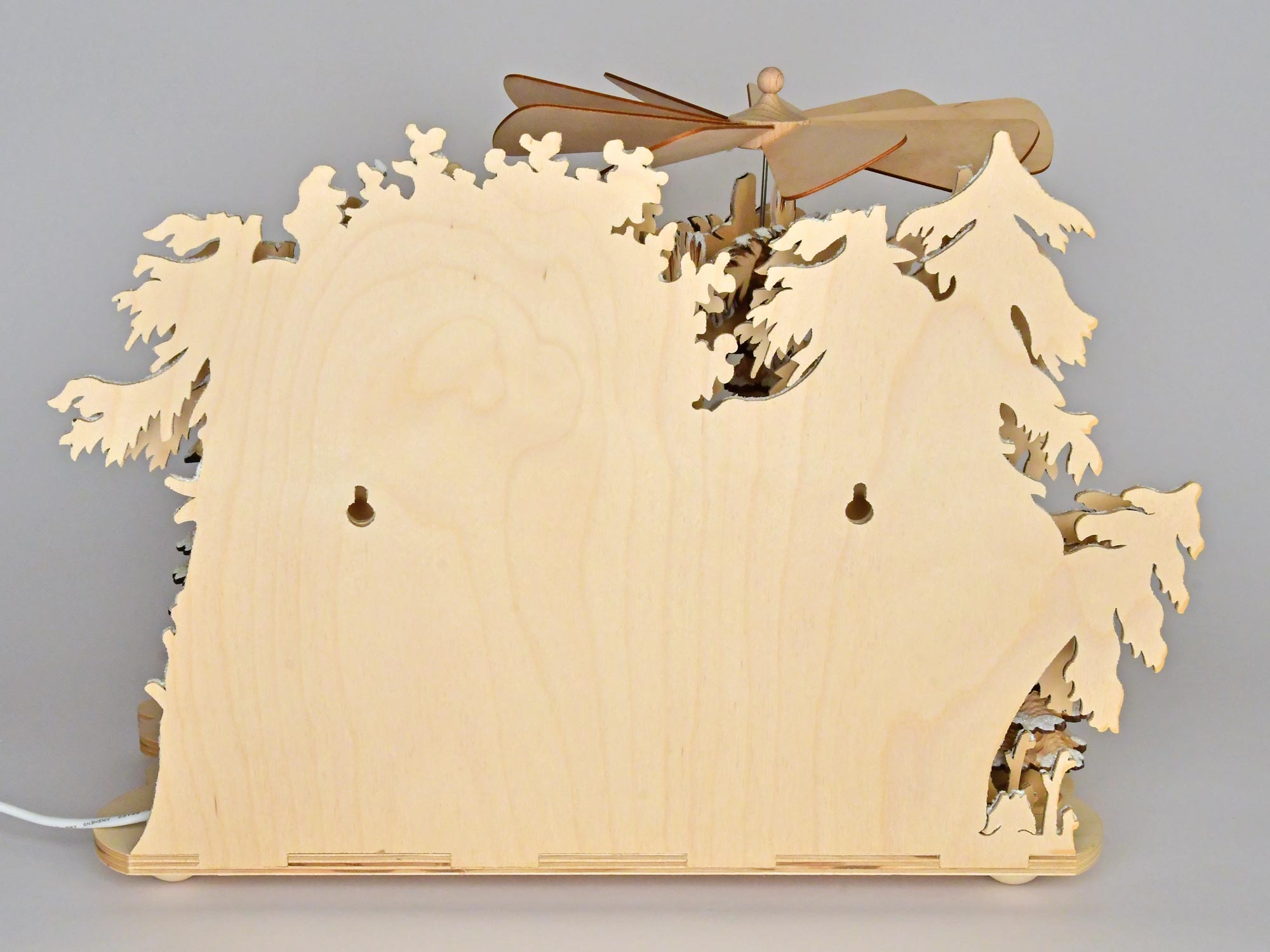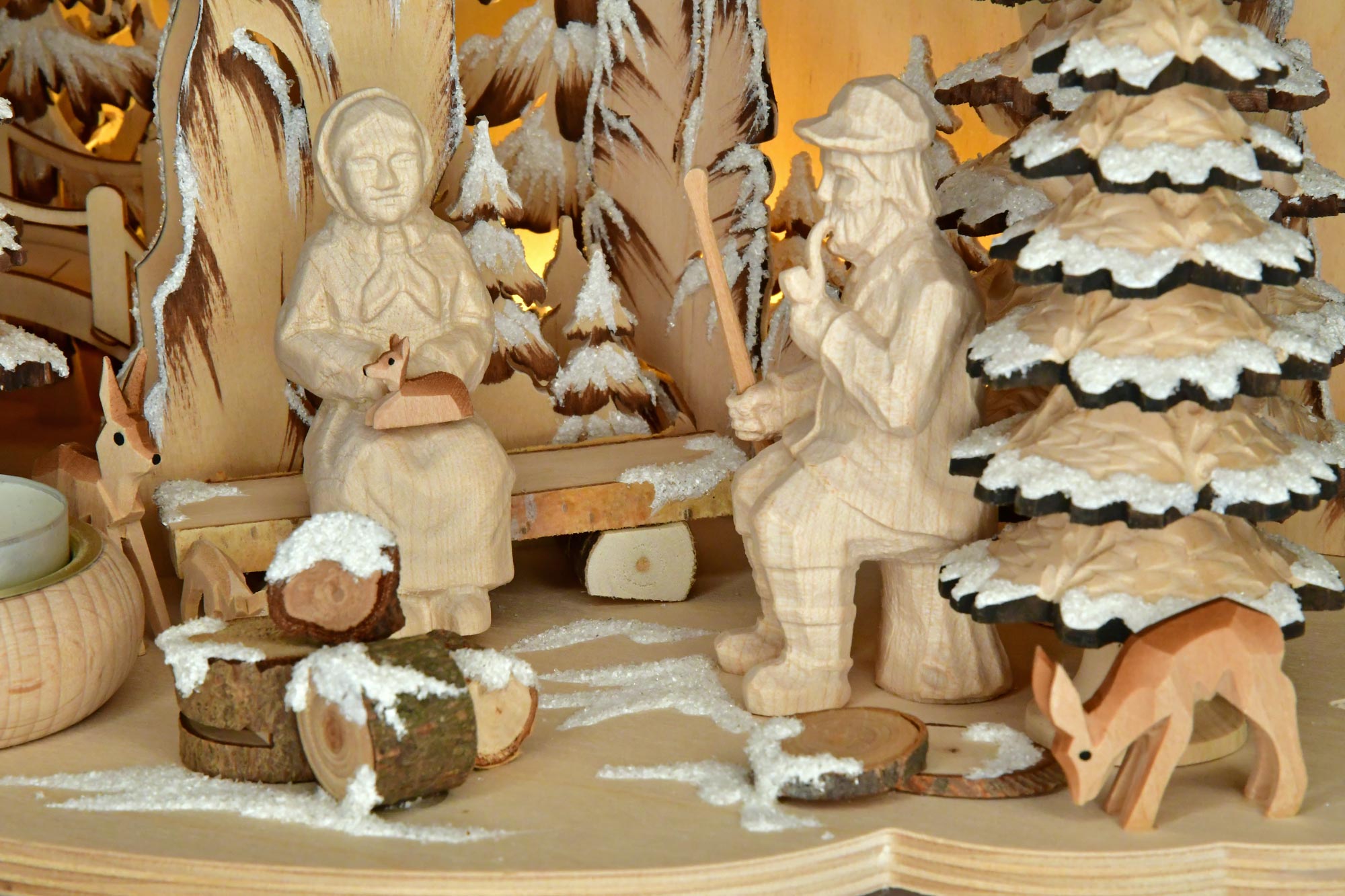 Diese hübsche Tischpyramide wurde mit Oma, Opa, Eichhörnchen, Tannenbäumchen, Zapfen und Reh bestückt. Angetrieben wird die Pyramide durch zwei angezündete Teelichter, die in die vorgesehenen Massivholzteelichthalter platziert werden. Eine indirekte LED-Beleuchtung bietet eine Zusatzfunktion und lässt die Pyramide auch ohne Kerzen stimmungsvoll erstrahlen. Glitzernder Raureif verleiht dieser RATAGS Pyramide den letzten Schliff. Rückseitig angebrachte Bohrungen ermöglichen eine Wandmontage der Pyramide.
