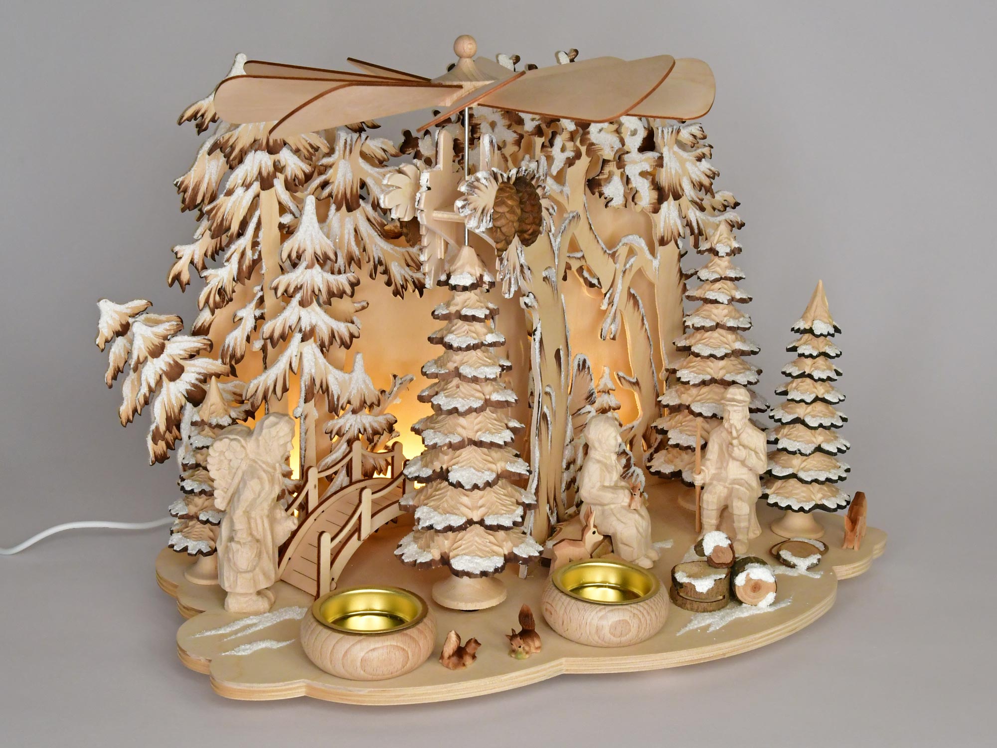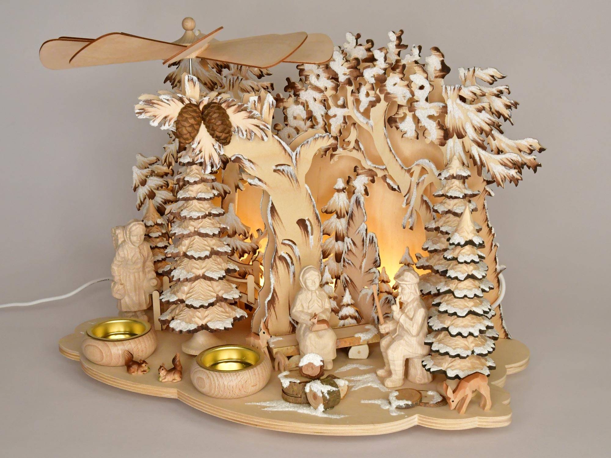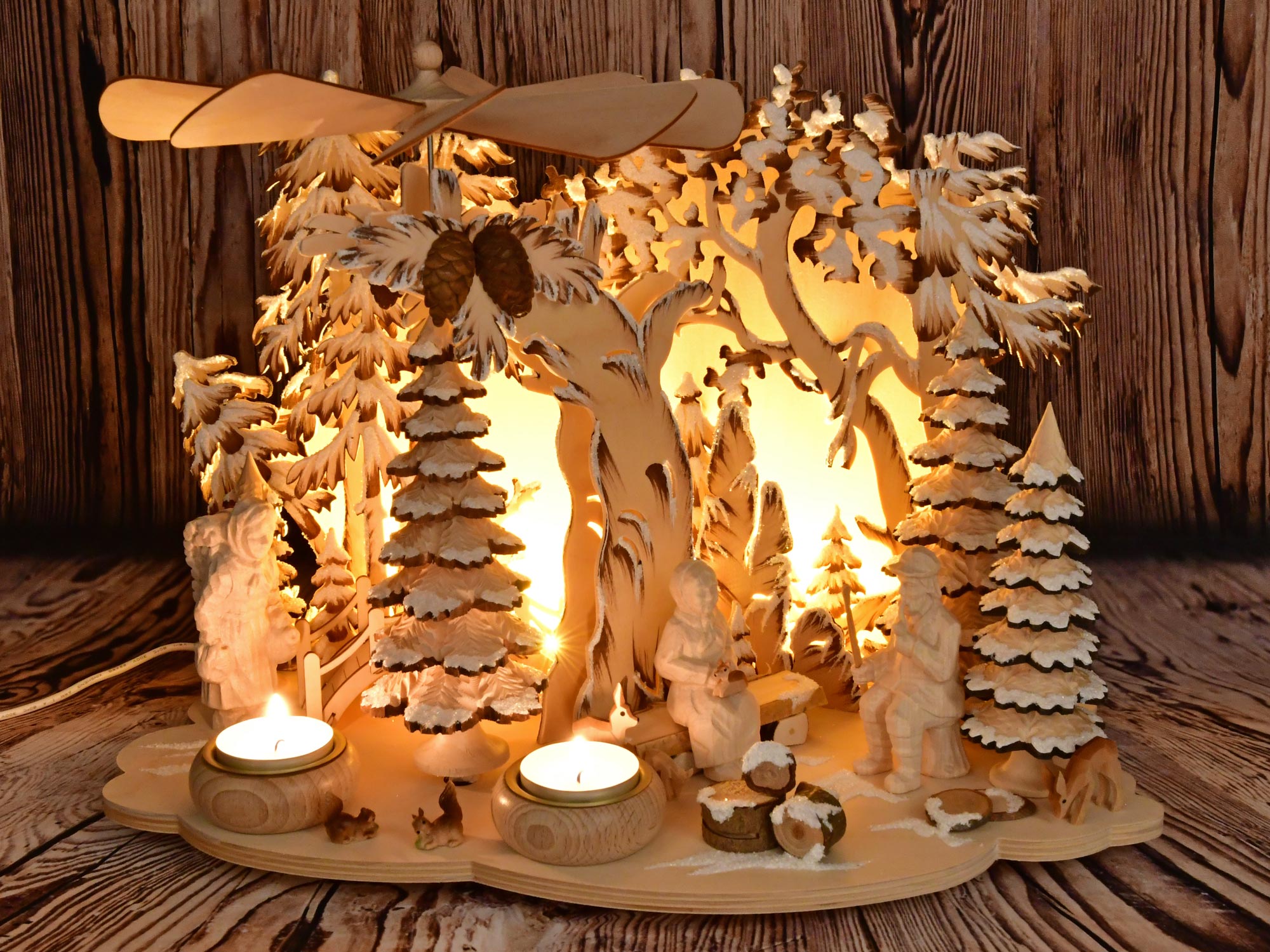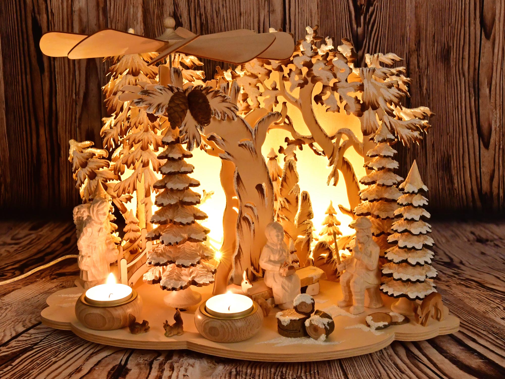Diese hübsche Tischpyramide wurde mit Oma, Opa, Eichhörnchen, Tannenbäumchen, Zapfen und Reh bestückt. Angetrieben wird die Pyramide durch zwei angezündete Teelichter, die in die vorgesehenen Massivholzteelichthalter platziert werden. Eine indirekte LED-Beleuchtung bietet eine Zusatzfunktion und lässt die Pyramide auch ohne Kerzen stimmungsvoll erstrahlen. Glitzernder Raureif verleiht dieser RATAGS Pyramide den letzten Schliff. Rückseitig angebrachte Bohrungen ermöglichen eine Wandmontage der Pyramide.