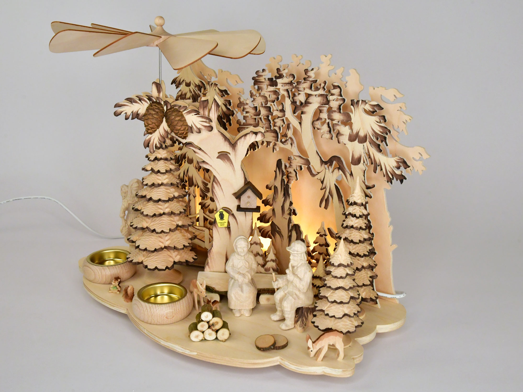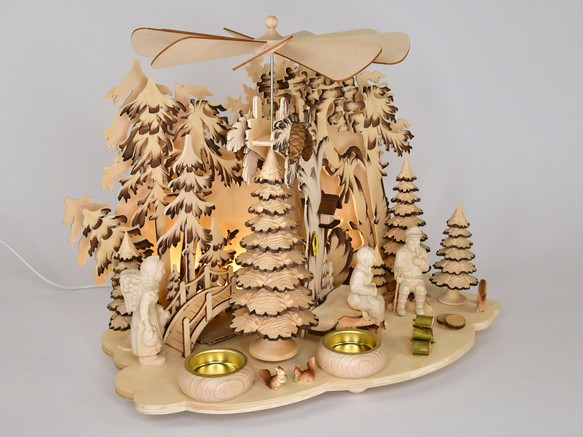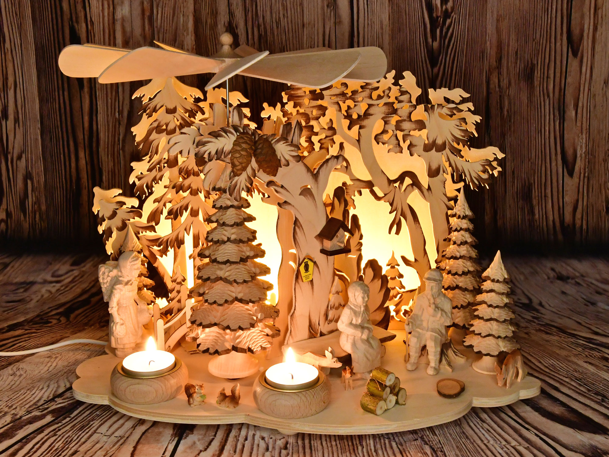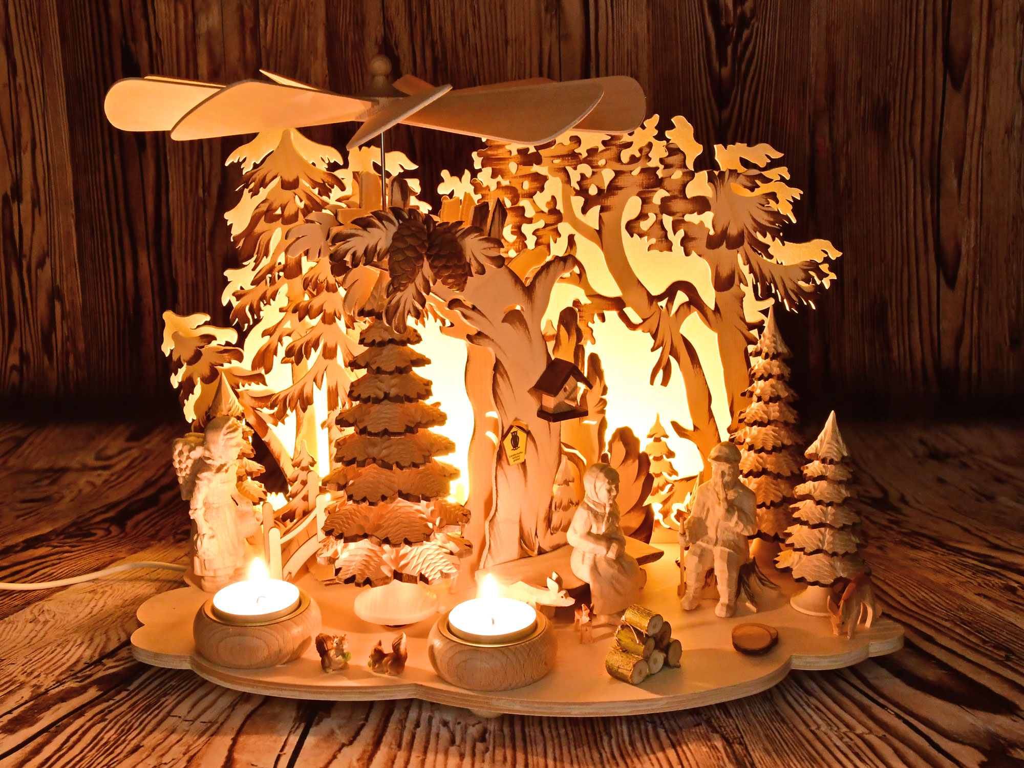 Diese hübsche Tischpyramide wurde mit Oma, Opa, Eichhörnchen, Tannenbäumchen, Zapfen und Reh bestückt. Angetrieben wird die Pyramide durch zwei angezündete Teelichter, die in die vorgesehenen Massivholzteelichthalter platziert werden. Eine indirekte LED-Beleuchtung bietet eine Zusatzfunktion und lässt die Pyramide auch ohne Kerzen stimmungsvoll erstrahlen.