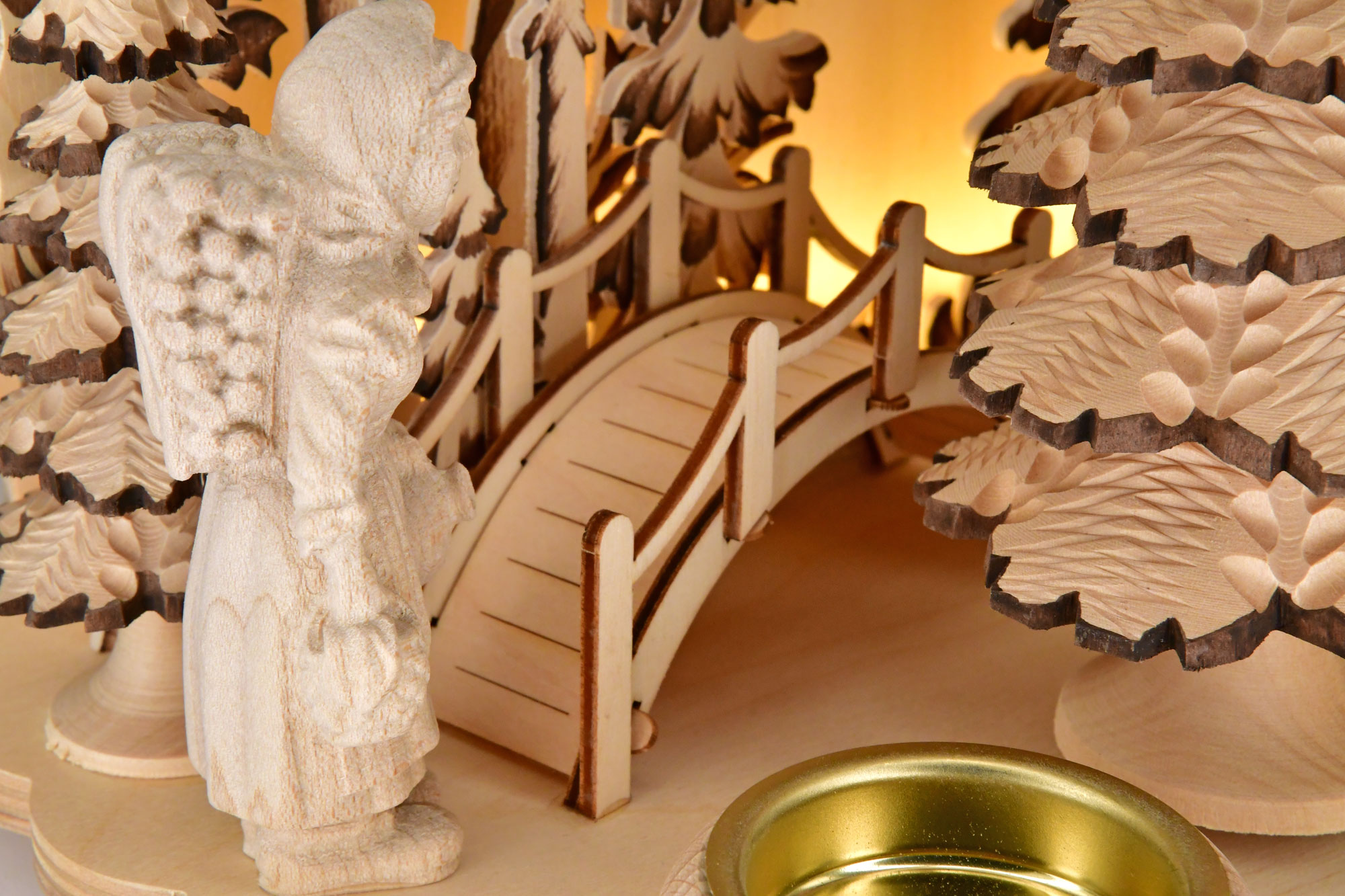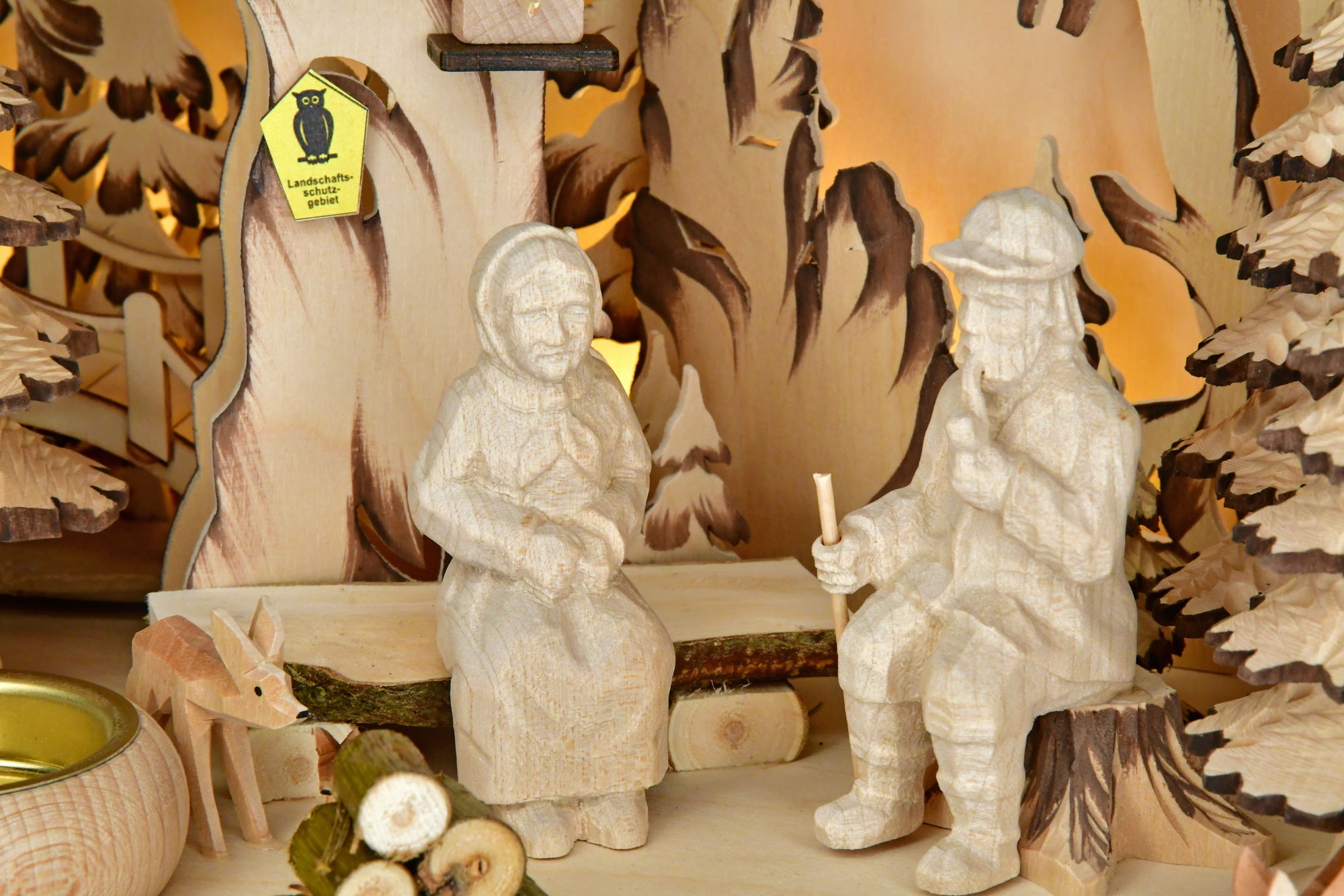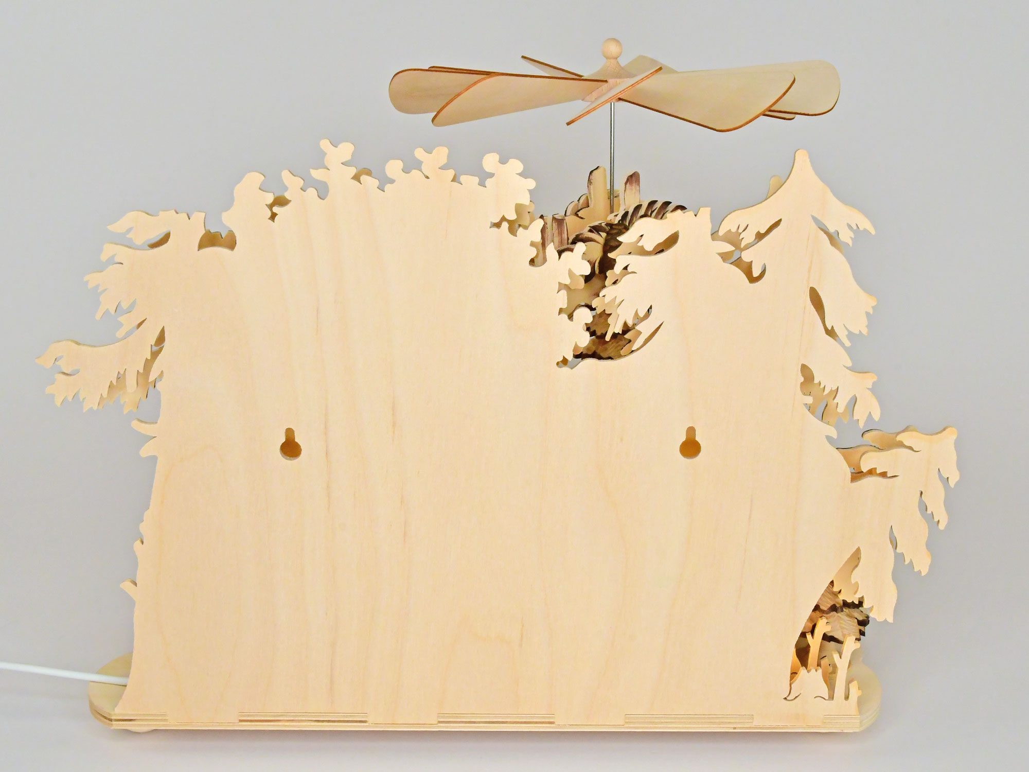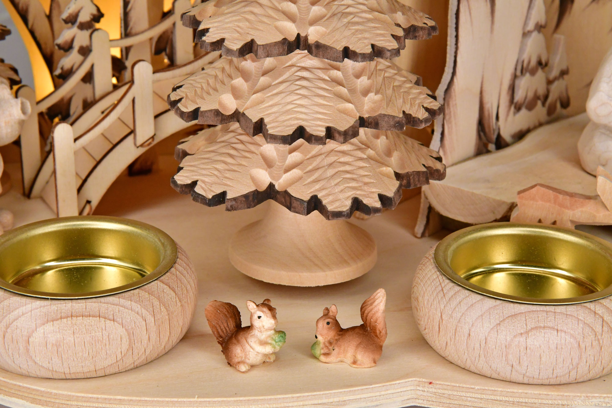Diese hübsche Tischpyramide wurde mit Oma, Opa, Eichhörnchen, Tannenbäumchen, Zapfen und Reh bestückt. Angetrieben wird die Pyramide durch zwei angezündete Teelichter, die in die vorgesehenen Massivholzteelichthalter platziert werden. Eine indirekte LED-Beleuchtung bietet eine Zusatzfunktion und lässt die Pyramide auch ohne Kerzen stimmungsvoll erstrahlen.